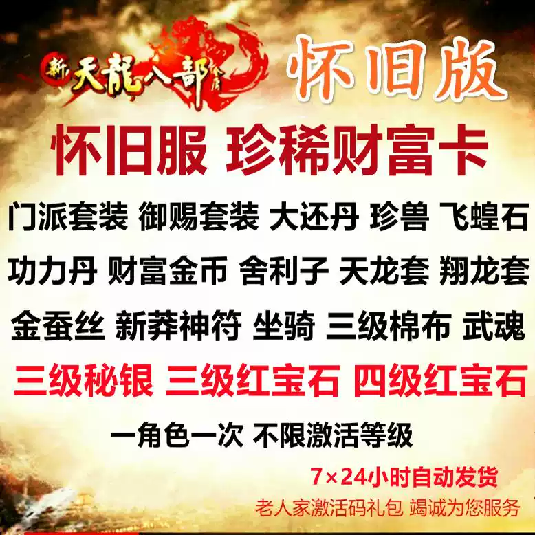 备注:客服审核商品只需拍下后联系客服交易,切勿主动联系其他人交易谨防被骗。虚拟物品发货后概不退款,未满成年禁止在平台消费任何商品。<br />财富卡只能用一张 注意区分怀旧和永恒经典,怀旧服-666财富卡,怀旧服-17173财富卡,永恒经典服-2888武圣卡财富卡,永恒经典服-17173财富卡,永恒经典服-物品卡-老友礼包<br />1级:BUFF:龙行天下(点击后自身所有属性+30,持续30分钟,有效期7天)、天龙侠情剑*1天龙侠情指环*1、天龙侠情护符*1<br />10级:5格行囊:绵制囊*1、5格材料箱:榆木箱*1、30天坐骑:憨宝熊*1<br />15级:翔龙衣*1、翔龙鞋*1、翔龙腰带*1、翔龙手套*1<br />25级:财富银币(可兑换为游戏币)*1、大还丹(可增加50万角色经验)*1<br />30级:暗器:飞蝗石*1、御赐套装1套、珍兽舍利子*1、<br />稀有珍兽:傀儡狼(20级:可携带)*1<br />40级:天灵丹*1、财富金币*1、门派套装1件、表情包:蛋蛋*1、千淬神玉*2、<br />新莽神符1级*3<br />50级:五艺残卷*5、绛紫仙露*2、门派套装2件、珍兽融合丹*10、新莽神符2级*3 、<br />悟灵珠*3<br />60级:天灵丹*2、彻地符箓*1、1级:棉布*1、武魂:琉璃焰*1、武魂:御瑶盘*1<br />70级:功力丹*3、1级:秘银*1、丹青*20、衣服体力雕文图样*1、雕纹蚀刻溶剂*1<br />80级:真元精珀*2、翡翠心精*6、玉龙髓*5、元宝赠点13520点、金蚕丝*5、新莽神符5级*2 、离火*50 、精金石*30<br />90级:玄兵石*2、玄灵丹*1、元宝赠点15920点、三级:红宝石*1、金蚕丝*10、九天玉碎*20<br />100级:玄灵丹*2、元宝赠点23840点、四级:红宝石*1、三级:秘银*1、三级:棉布*1<br />105级:元宝赠点28200点、玄灵丹*3、伏羲玉*10、命魂玉*20<br />110级:元宝赠点34040点<br />