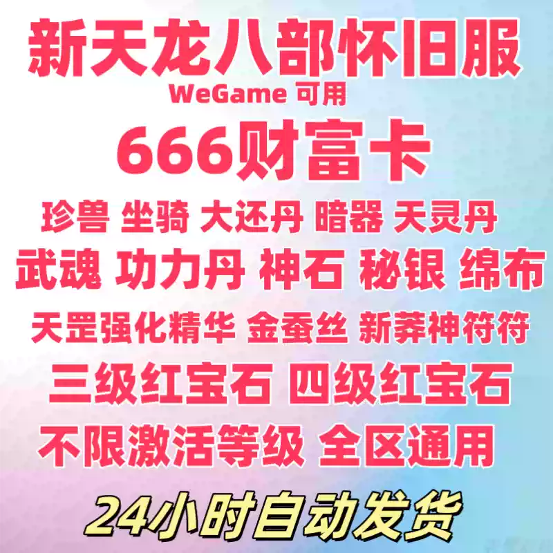 备注:客服审核商品只需拍下后联系客服交易,切勿主动联系其他人交易谨防被骗。虚拟物品发货后概不退款,未满成年禁止在平台消费任何商品。<br />财富卡只能用一张 注意区分怀旧和永恒经典,怀旧服-666财富卡,怀旧服-17173财富卡,永恒经典服-2888武圣卡财富卡,永恒经典服-17173财富卡,永恒经典服-物品卡-老友礼包<br />1级:BUFF:龙行天下(点击后自身所有属性+30,持续30分钟,有效期7天)、天龙侠情剑*1天龙侠情指环*1、天龙侠情护符*1<br />10级:5格行囊:绵制囊*1、5格材料箱:榆木箱*1、30天坐骑:憨宝熊*1<br />15级:翔龙衣*1、翔龙鞋*1、翔龙腰带*1、翔龙手套*1<br />25级:财富银币(可兑换为游戏币)*1、大还丹(可增加50万角色经验)*1<br />30级:暗器:飞蝗石*1、御赐套装1套、珍兽舍利子*1<br /><br />40级:天灵丹*1、财富金币*1、门派套装1件、表情包:蛋蛋*1、千淬神玉*2、<br />新莽神符1级*3<br />50级:五艺残卷*5、绛紫仙露*2、门派套装2件、珍兽融合丹*10、新莽神符2级*3 、<br />悟灵珠*3<br />60级:天灵丹*2、彻地符箓*1、1级:棉布*1、武魂:琉璃焰*1、武魂:御瑶盘*1<br />70级:功力丹*3、1级:秘银*1、丹青*20、衣服体力雕文图样*1、雕纹蚀刻溶剂*1<br />80级:真元精珀*2、翡翠心精*6、玉龙髓*5、元宝赠点13520点、金蚕丝*5、新莽神符5级*2 、离火*50 、精金石*30<br />90级:玄兵石*2、玄灵丹*1、元宝赠点15920点、三级:红宝石*1、金蚕丝*10、九天玉碎*20<br />100级:玄灵丹*2、元宝赠点23840点、四级:红宝石*1、三级:秘银*1、三级:棉布*1<br />105级:元宝赠点28200点、玄灵丹*3、伏羲玉*10、命魂玉*20<br />110级:元宝赠点34040点<br />
